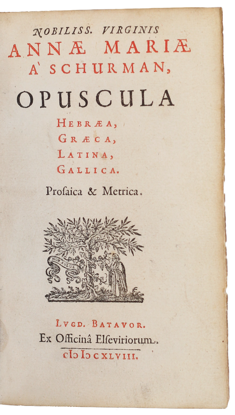 SCHURMAN, Anna Maria van.Opuscula hebraea, graeca, latina, gallica: prosaica & metrica. Edited by Friedrich Spanheim. Leiden: ‘Officinâ Elseviriorum’ [i.e. Bonaventure and Abraham Elzevier], 1648. First edition.