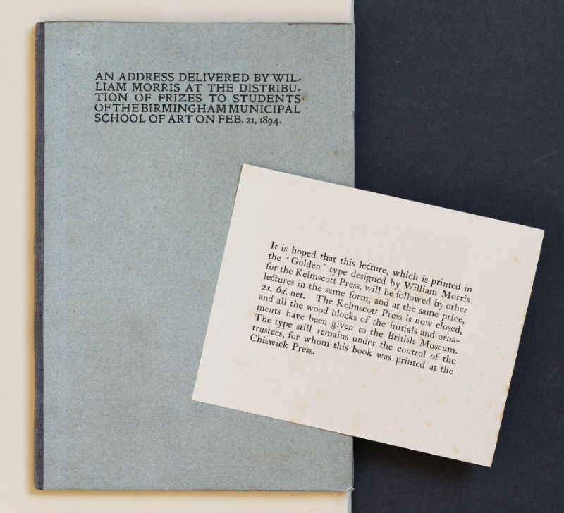 MORRIS, William. An Address Delivered by William Morris at the Distribution of Prizes to Students of the Birmingham Municipal School of Art on Feb. 21, 1894. [Edited by Sydney Carlyle Cockerell]. London: The Chiswick Press for Longmans & Co., 1898.