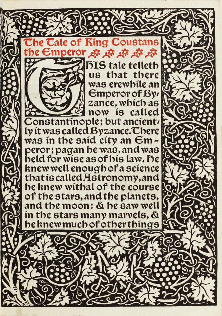 MORRIS, William (translator). The Tale of the Emperor Coustans and of Over Sea. Hammersmith: ‘printed by […] William Morris at the Kelmscott Press […]. Sold by William Morris, at the Kelmscott Press’, 1894.